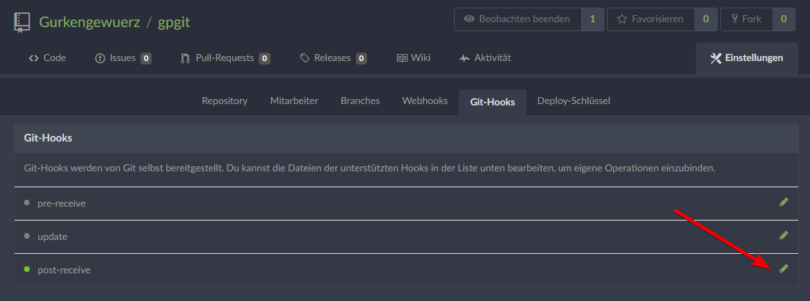 Gitea unterstützt ein paar Git-Hooks, die eine einfache Möglichkeit bieten, ein Skript auszuführen. Die wichtigsten Hooks unterstützt Gitea: