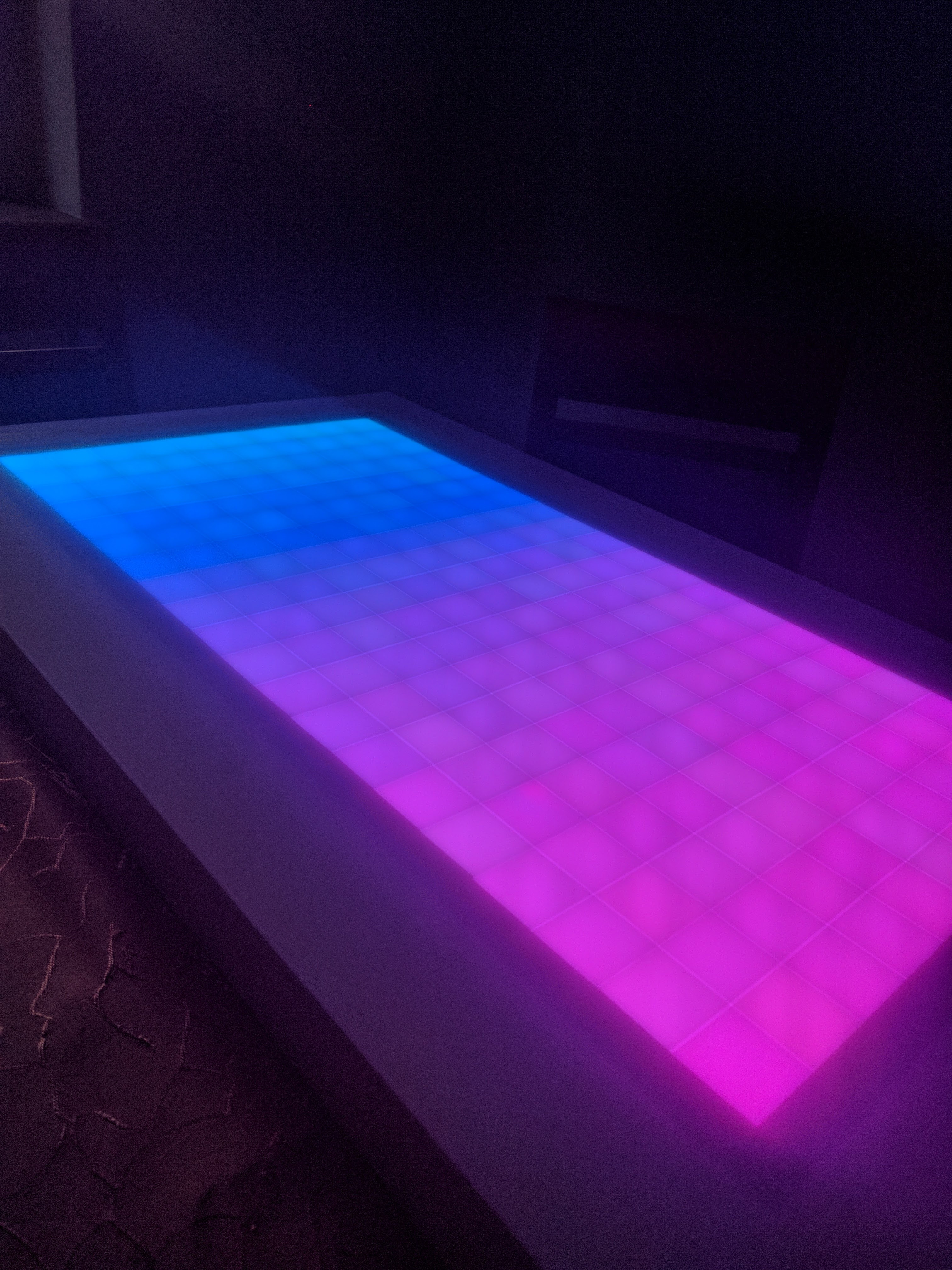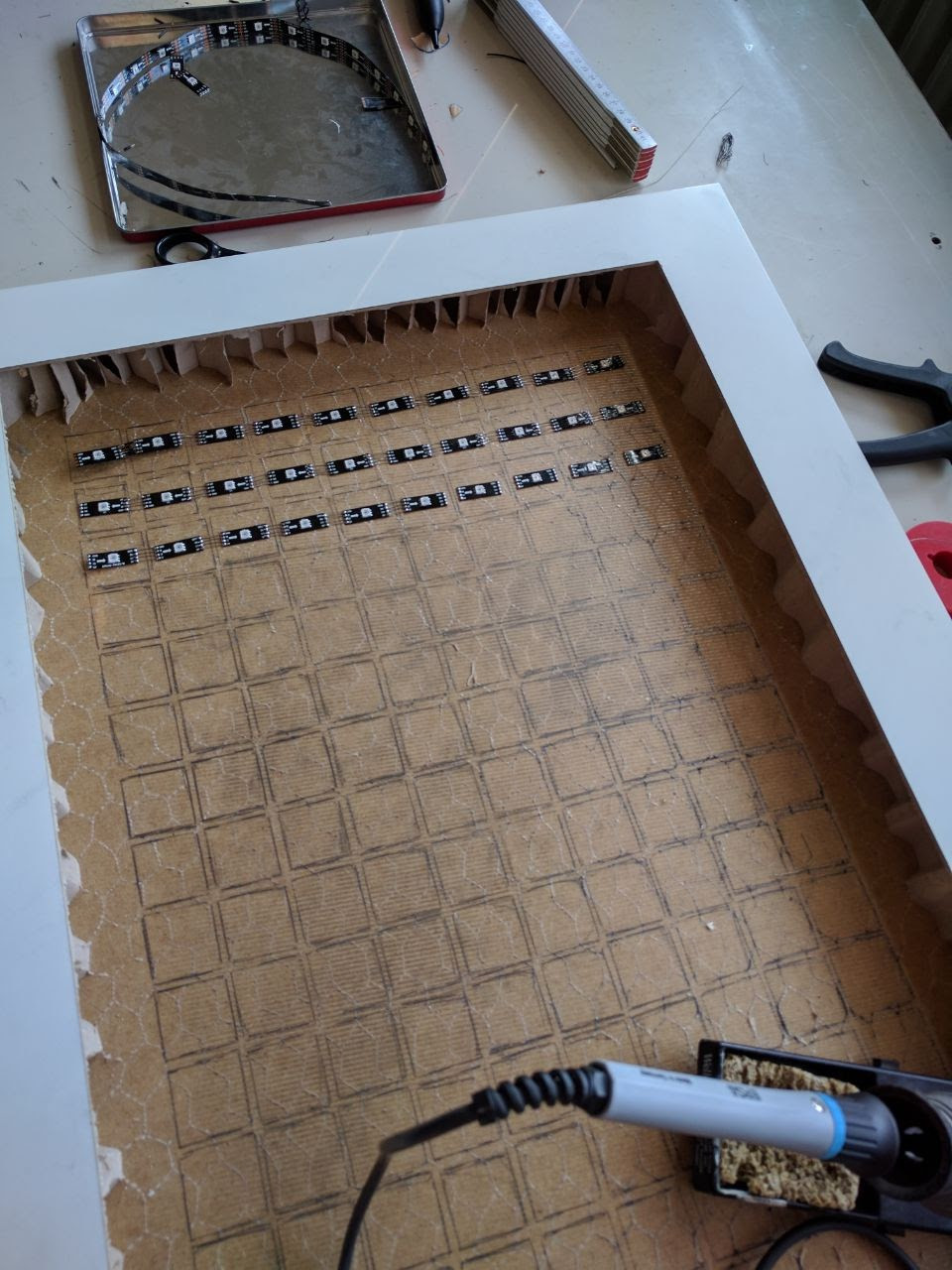 In Zuge eines 8-wochigen Betriebspraktikum im Sommer 2017, haben ein Mitschuler und ich an der Hochschule Bochum, einen RGB-LED-Tisch gebaut. In diesem Projekt ging es darum, dass ein RGB-LED-Matrix-Tisch mit 10 Pixeln in der Breite und 20 Pixelnin der Lange gebaut werden sollte, um spater ehemalige 8-bit-Klassiker wie Tetris auf dem Tisch zu spielen. Dafur wurde ein IKEA-Tisch verwendet, um die RGB-LEDs einzubauen. Der Tisch wurde so umgebaut, dass ein Rechteck aus dem Tisch geschnitten und in den Tische in Gitter aus finnischer Holzpappe eingelegt wurde. Zur Verfugung wurden 200 RGB-LEDs und ein Raspberry Pi Zero W gestellt, mit dem die Steuerung der RGB-LEDs ubernommen wurde. Auf die RGB-LEDs wurde ein uberfang aus weiem Milchglas aufgelegt, um das Licht der RGB LEDs zu streuen, womit es besser dargestellt wird. Auserdem wurde eine Android-App geschrieben, die als Controller fur die Spiele verwendet wird. Die Verbindung der Steuerung zu dem Tisch wurde uber Bluetooth hergestellt. Als Programmiersprache wurde Java eingesetzt. Als LED-Typ wurden die APA102 Chips verwendet.