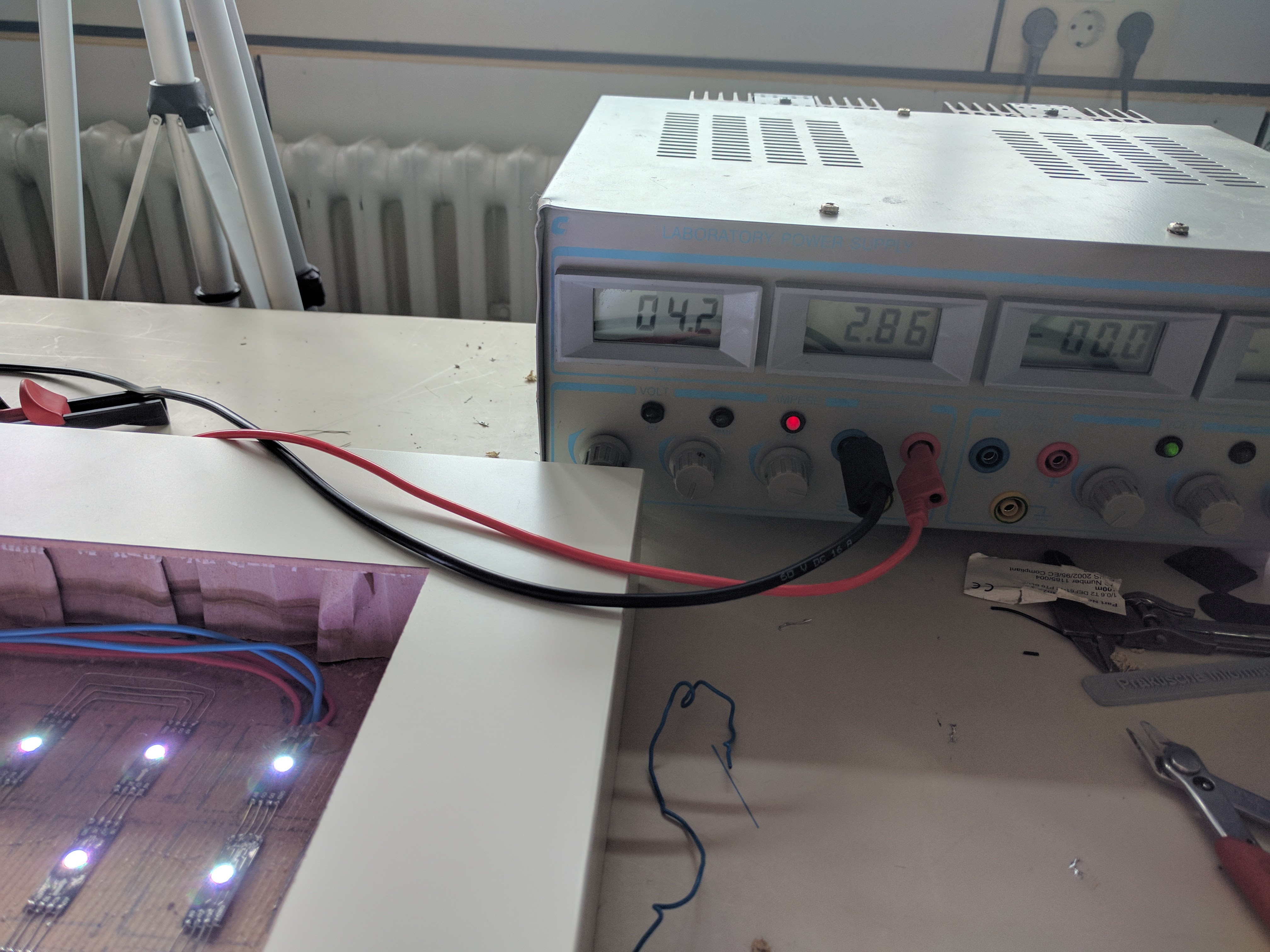 Der Draht, welchen ich fur die Lotungen verwendet habe, hatte einen Durchmesser von 0.5 mm. Wegen der hohen Stromstarke musste ich auf einen etwas dickeren Draht zuruckgreifen, da dieser sonst ziemlich hei werden konnte und ein Sicherheitsrisiko darstellen wurde. Der Draht fur die Stromleitungen hatte einen Durchmesser von 0.8 mm. Ich habe den Strom so verteilt, dass er an vier Stellen von den LEDs eingespeist wird. Das hat den Grund, dass die LEDs sonst zu wenig Strom bekommen und somit nicht hell leuchten oder sogar gar nicht funktionieren.