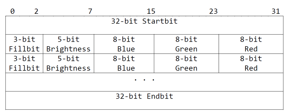 Ein Datenpaket fur den LED-Strip benotigt u.a. ein Start Frame. Dies hat die Auswirkung, dass die RGB-LEDs aktualisiert werden. Dieses Paket muss mindestens 32 Bits gro sein und mit fuhrenden Nullen beginnen. Der Frame mit den Eigenschaften in dem Paket fur die RGB-LED wird anhand der drei fuhrenden Einsen von der RGB-LED erkannt. Auf die Fullbits folgt die Helligkeit. Die Helligkeit kann einen Wert von 0 bis 31 Bits annehmen, wobei 0 fur nicht aktiv steht. Nach der Helligkeit folgen die drei Farben Blau, Grun und Rot. Diese kann man mischen, sodass man uber sechzehn Millionen mogliche Farben erzeugen kann. Die Farben nehmen jeweils acht-Bits ein. Fur jede angeschlossene LED wird dies wiederholt (Fullbit, Helligkeit, Blau, Grun, Rot) gesendet. Am Ende des Pakets folgen 32 Endbits.