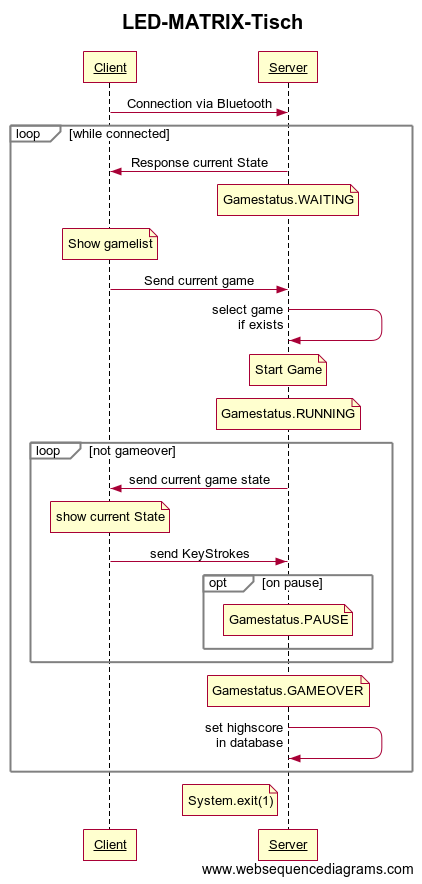 Solange ein Spiel lauft und nicht beendet ist, sei es durch manuelles Unterbrechen oder ein Game Over, liest der Server die Tastendrucke aus, die von dem Controller aus der Smartphone-App gesendet werden. Sobald in den Spielmodus Game Over geschaltet wird, werden die aktuellen Daten mit dem Punktestand in eine SQLite-Datenbank geschrieben. Erkennt das Smartphone ein Game Over, so bekommt der Nutzer uber die App ein haptisches Feedback. Sollte der Client seine Verbindung trennen, sei es durch den Verlust der Verbindung oder durch ein beabsichtigtes Trennen, startet die Applikation seinen Bluetooth-Server neu und erlaubt wieder die Verbindung neuer Gerate.